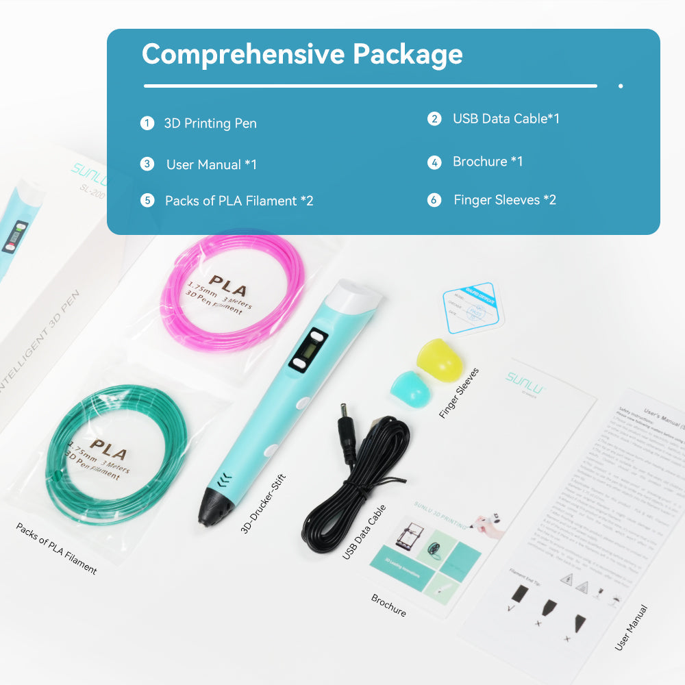 La penna 3D SL-200 è fornita in una confezione regalo elegante, rendendola un regalo perfetto per artisti, appassionati e bambini. Include una garanzia di un anno, che copre i difetti di fabbricazione ma esclude danni causati da filamenti non originali o uso improprio.