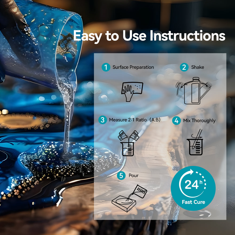 [FACILE DA USARE CON LE PARTI A E B] Agitare la bottiglia per mescolare bene la resina. Mescolare la resina e l'indurente in un rapporto 2:1 e mescolare per 3-5 minuti. Completare il progetto in 40 minuti.