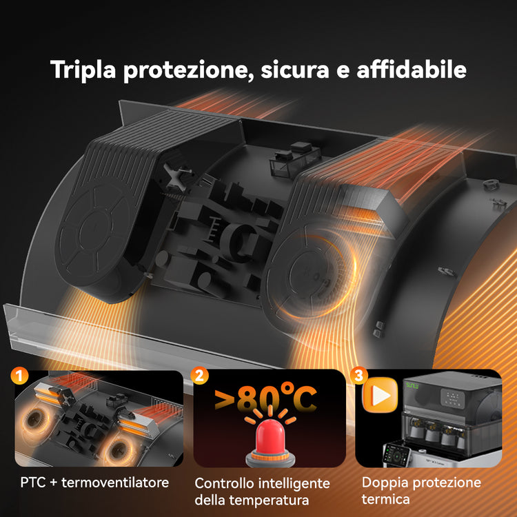 Riscaldamento PTC. Protezione a doppio livello con interruttore di controllo della temperatura. Controllo intelligente della temperatura basato su software, monitoraggio in tempo reale della temperatura e controllo automatico del sistema di riscaldamento. Temperatura massima di essiccazione di 70°C. Allarmi attivati quando la temperatura supera il valore impostato di 10°C, quando la temperatura non aumenta o quando il ventilatore presenta malfunzionamenti. Il dispositivo funziona secondo il tempo impostato e si spegne automaticamente quando il tempo raggiunge zero.