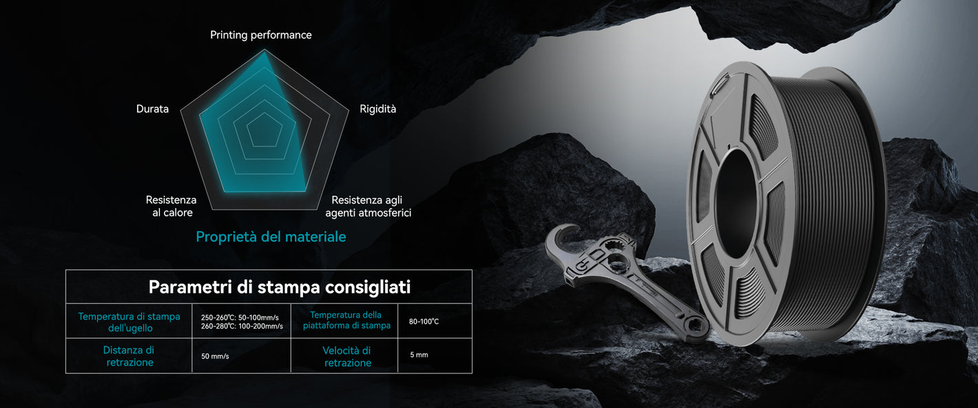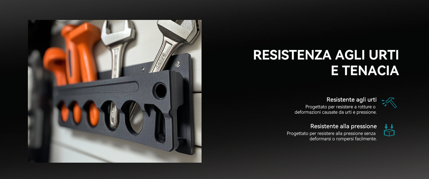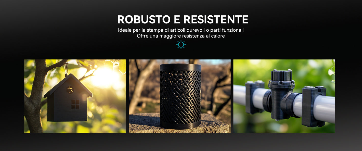 Il filamento ABS può resistere a un uso prolungato senza usurarsi o danneggiarsi, ed è resistente a rotture o deformazioni quando sottoposto a impatti o pressioni.