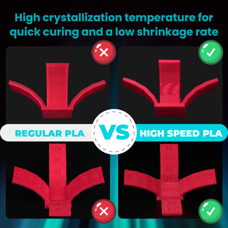 Con una velocità di stampa normale di 0-100mm/s, la qualità è superiore al PLA: superficie più liscia, prestazioni migliori negli svasi (angolo di svaso <70° senza necessità di supporti), con grande risparmio di tempo e riduzione degli sprechi di materiale. Stampa rapida a bassa temperatura, più veloce ed energeticamente efficiente.