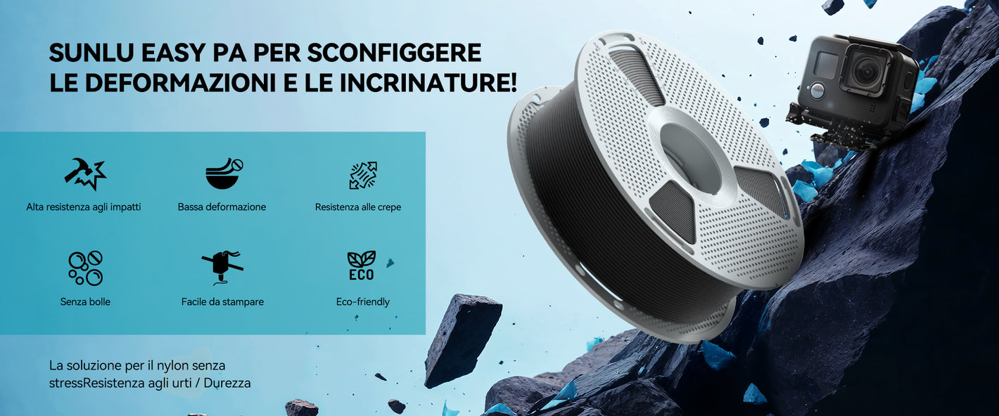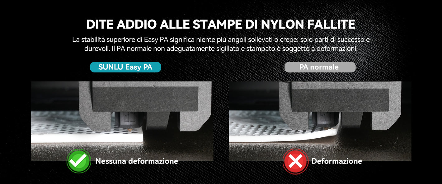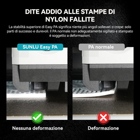 Stanco di lottare contro i noti problemi del filamento PA standard: fastidiose crepe, deformazioni ostinate e costante sensibilità all'umidità che rovinano le tue stampe e il filamento? SUNLU Easy PA è la soluzione ingegnerizzata che stavi aspettando!