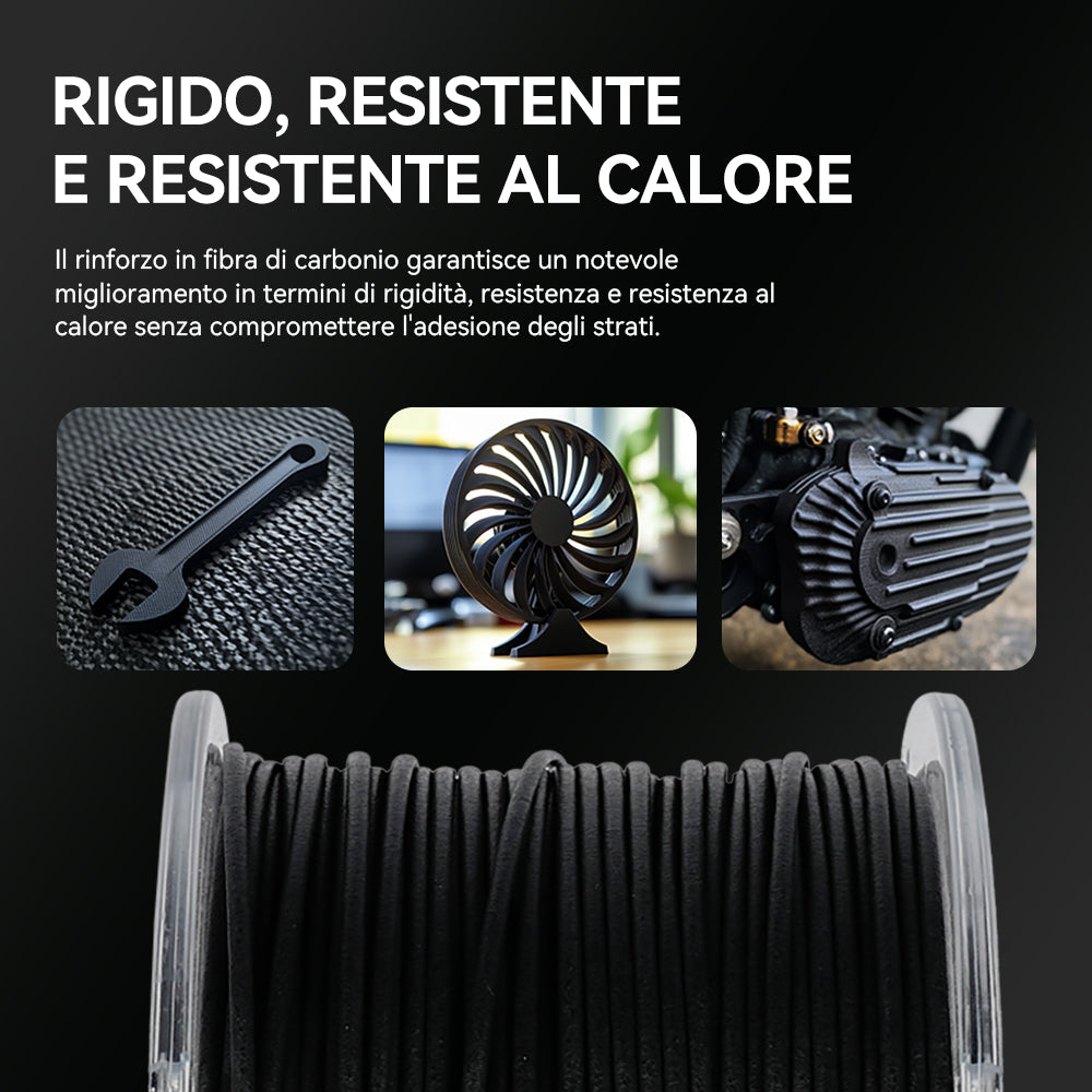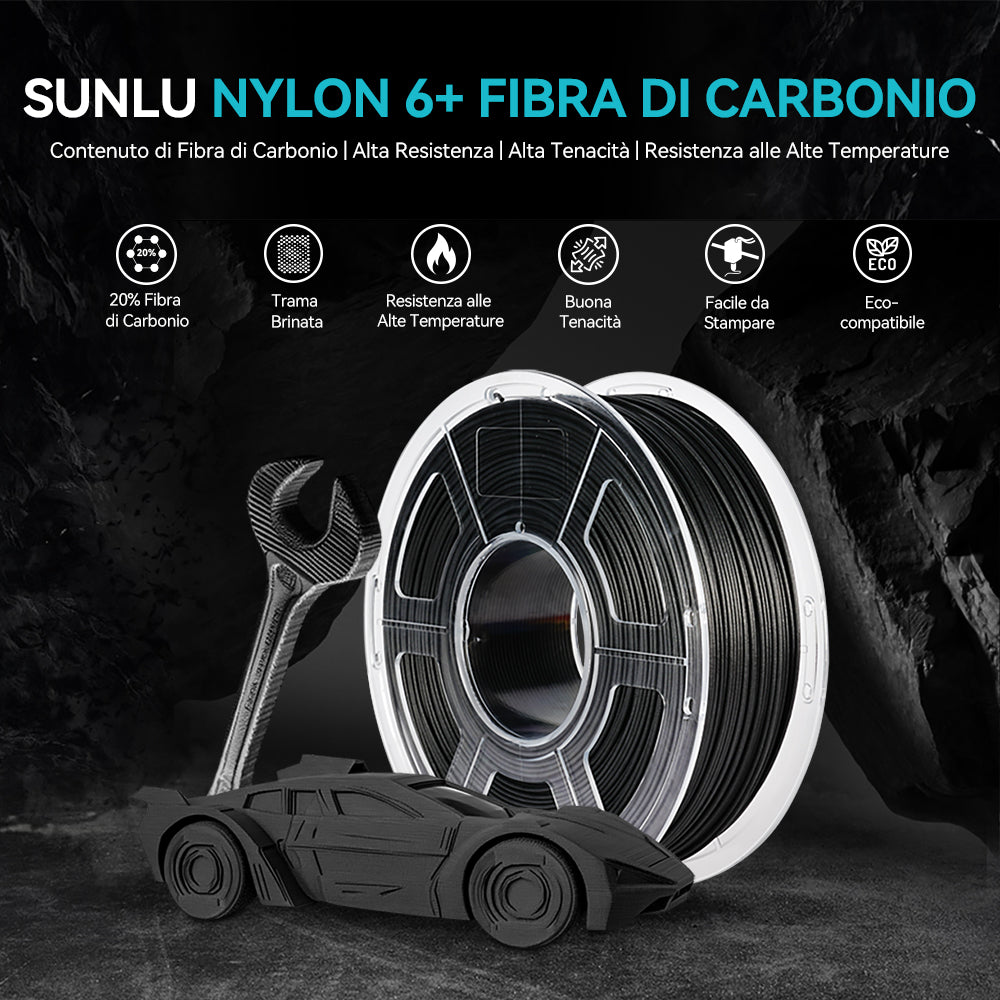 [Elevata Resistenza & Resistenza al Calore] Il filamento SUNLU PA6-CF in nylon rinforzato con fibra di carbonio combina 80% PA e 20% fibra di carbonio, offrendo rigidità, resistenza e termostabilità eccezionali. Garantisce un'eccellente adesione tra gli strati, rendendolo ideale per applicazioni ad alte prestazioni.