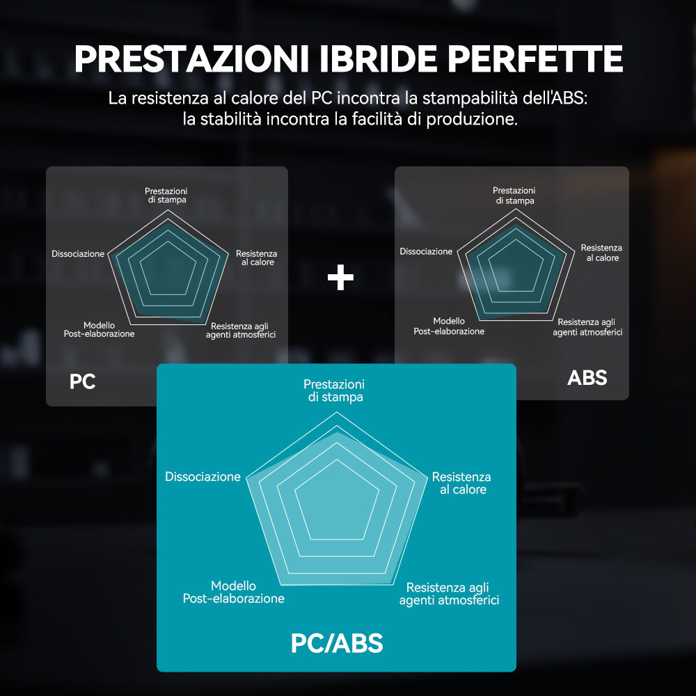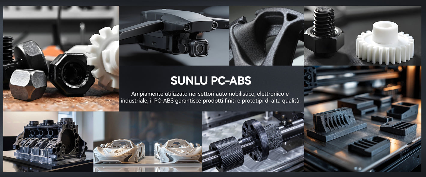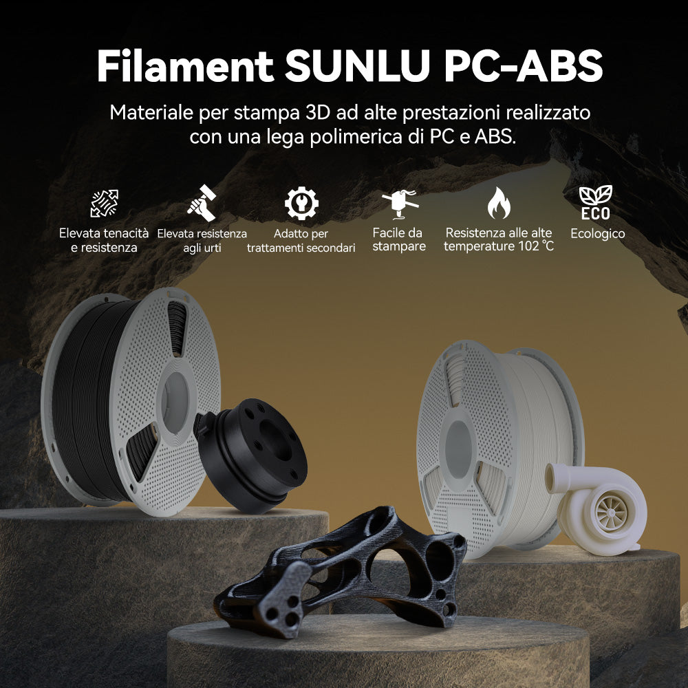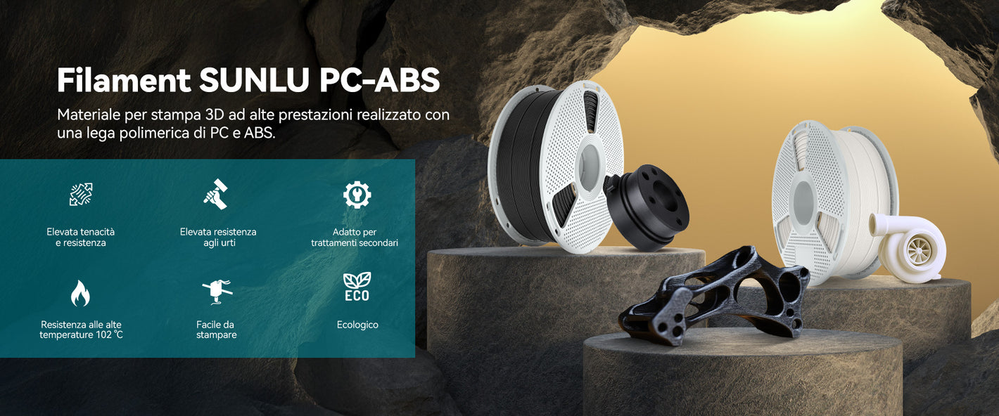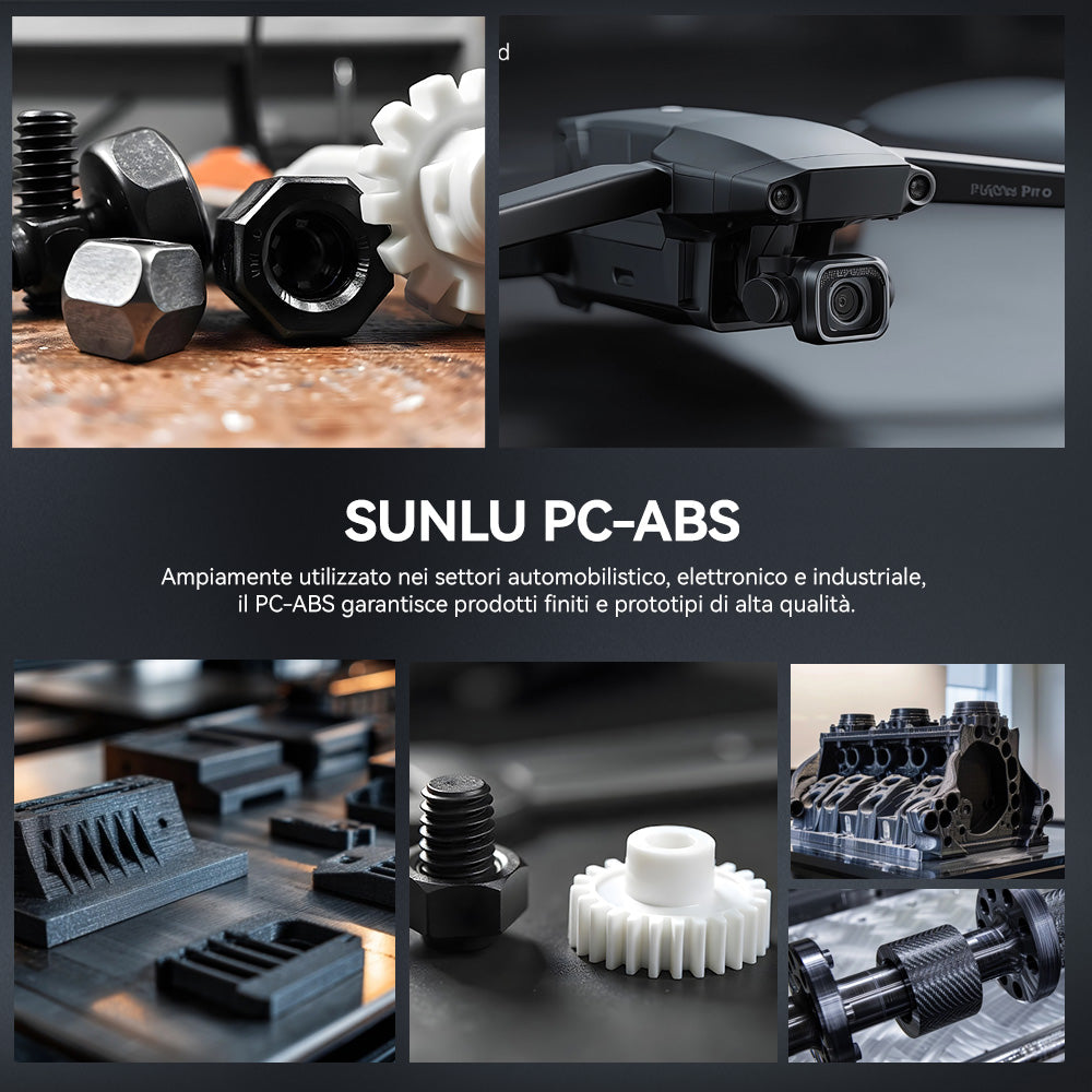[Filamento PC ad alte prestazioni] Il filamento SUNLU PC-ABS è un materiale per la stampa 3D ad alte prestazioni realizzato con una lega polimerica di PC (policarbonato) e ABS (acrilonitrile-butadiene-stirene). Combinando l'eccellente resistenza al calore e la robustezza del PC con le capacità di lavorazione migliorate dell'ABS, le parti stampate rimangono stabili anche a temperature elevate e in caso di urti. Questo materiale offre inoltre una finitura superficiale liscia ed è altamente compatibile con i rivestimenti metallici, rendendolo ideale per applicazioni che richiedono sia resistenza che estetica. Ampiamente utilizzato nei settori automobilistico, elettronico e industriale, il PC-ABS offre prodotti finiti e prototipi di alta qualità.
