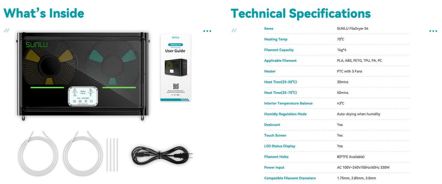 SUNLU FilaDryer S4 ha un design di 458 mm*218 mm*312 mm e contiene fino a 4 rotoli di filamento da 1 kg. Inoltre, è dotato di otto fori per i filamenti e di tubi in PTFE, che soddisfano le esigenze degli utenti di asciugare più filamenti e di stampare contemporaneamente con più stampanti.