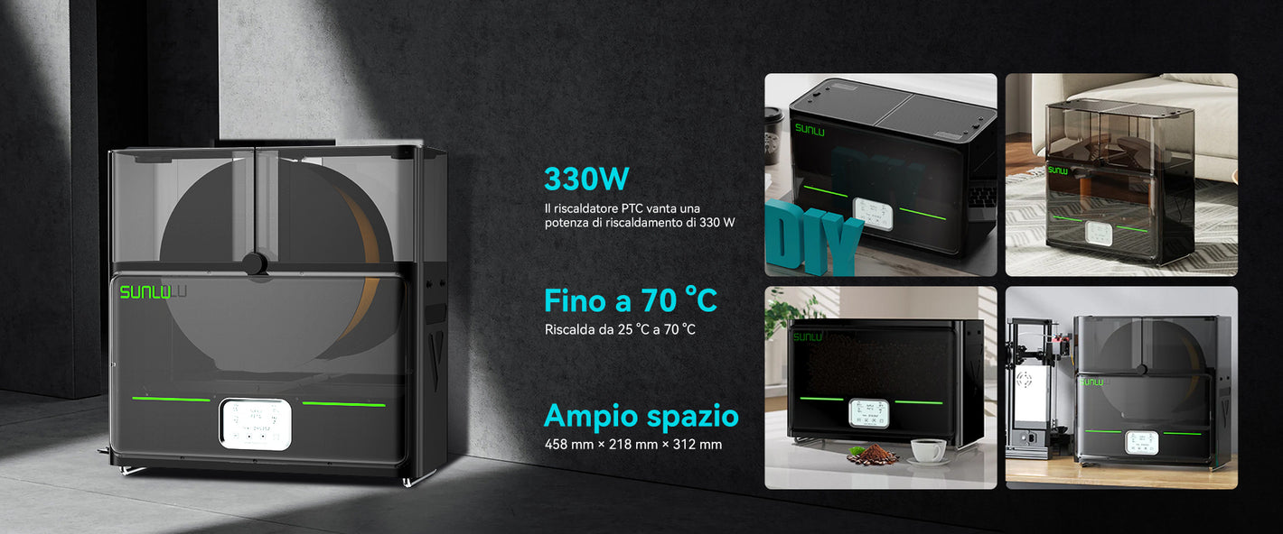 Non solo riscalda fino a 70°C, ma controlla anche l'umiditàIl calore interno viene fatto circolare in modo efficiente grazie a tre ventole che assicurano un grado di bilanciamento che raggiunge i +3°C. Completato da otto fori per i filamenti, il design espelle efficacemente l'umidità interna, evitando l'accumulo di umidità. Tutti questi accorgimenti servono a garantire che la temperatura impostata sulla macchina corrisponda a quella reale.