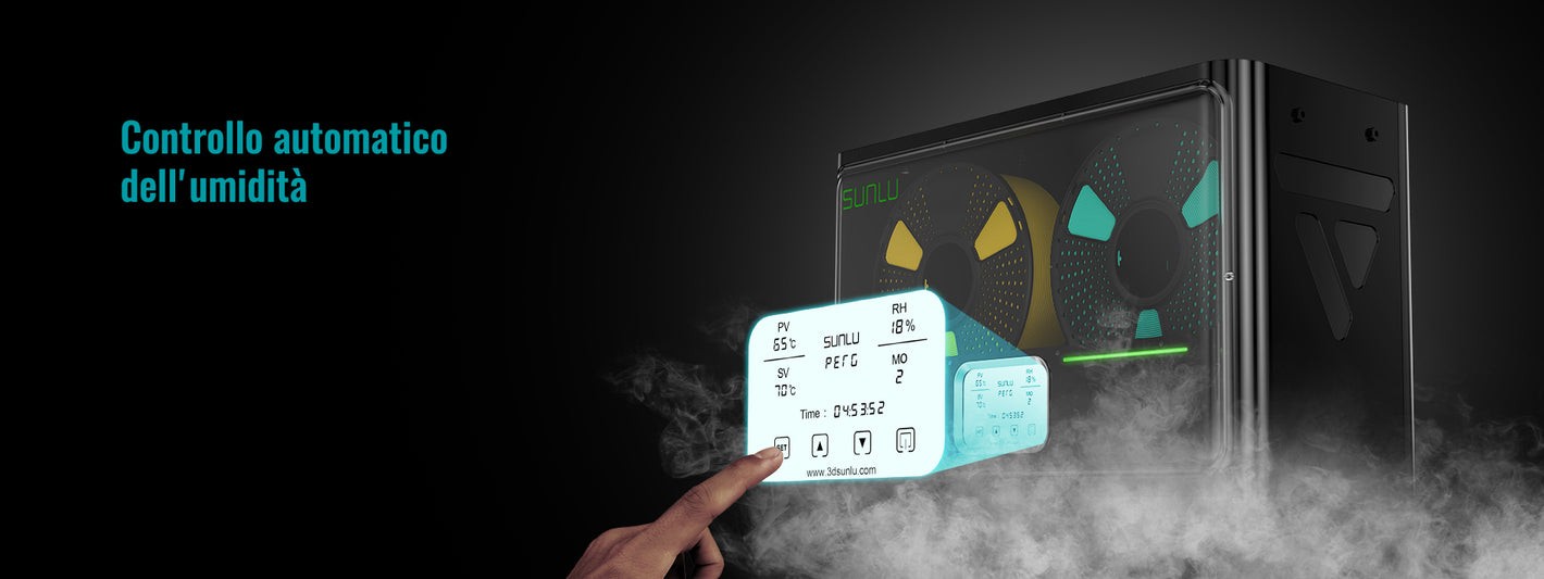 [Umidità Regolabile] Regola l'umidità interna (30%-50%). L'essiccatore si attiva automaticamente fino al raggiungimento del 25% di umidità, adattandosi alle esigenze di diversi materiali.