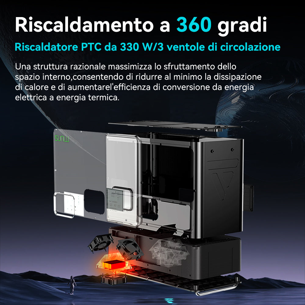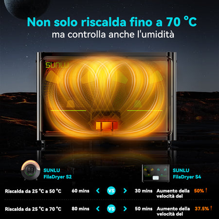 SUNLU FilaDryer S4 è dotato di un elemento riscaldante PTC e di una tripla configurazione e dimostra quindi una maggiore efficienza di riscaldamento, essendo in grado di riscaldare fino a 70°C in un tempo più breve. Il riscaldatore PTC vanta una potenza di riscaldamento di 330 W, un aumento di 6,9 volte rispetto a quella di SUNLU FilaDryer S2.