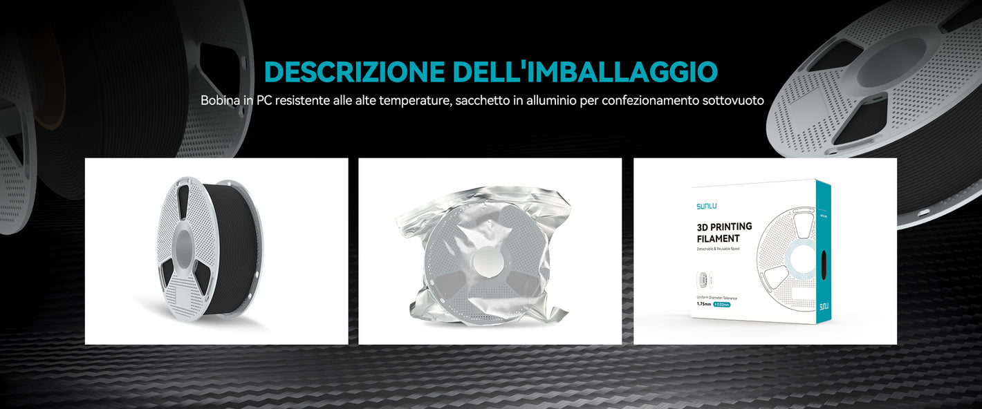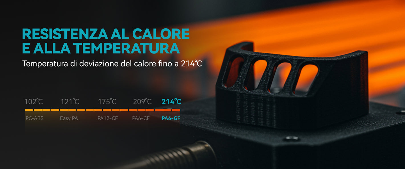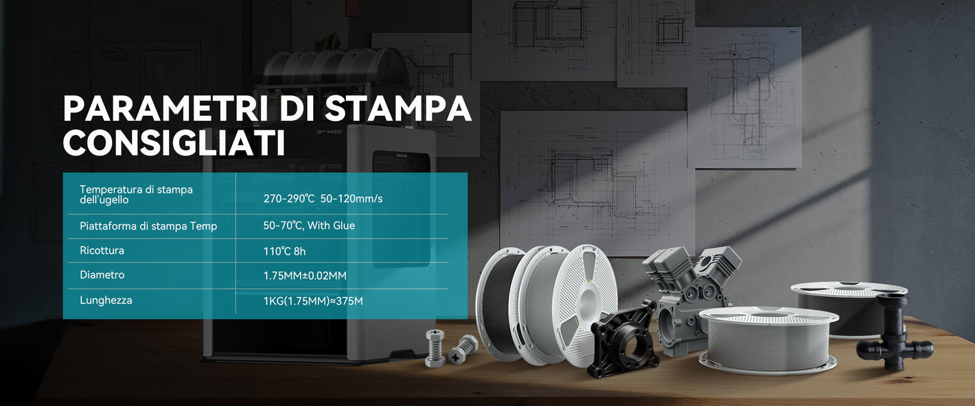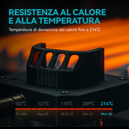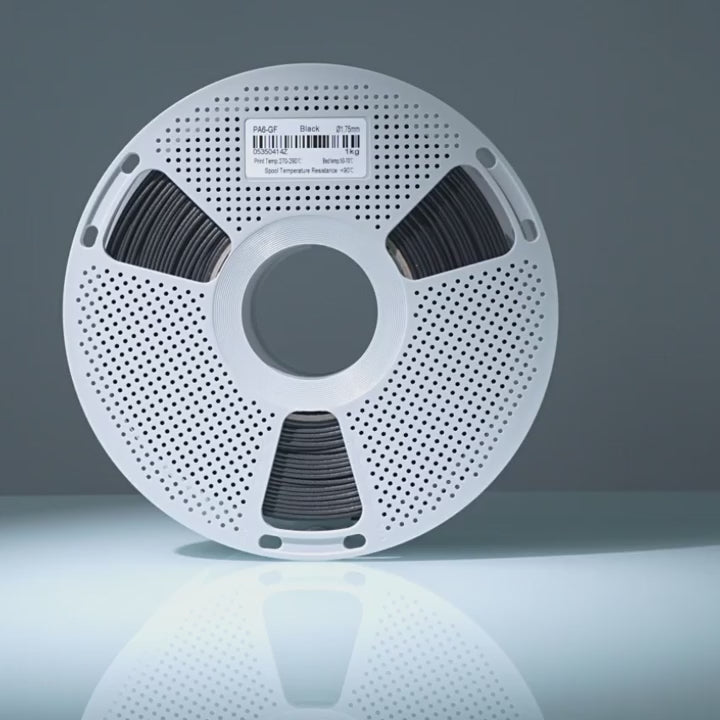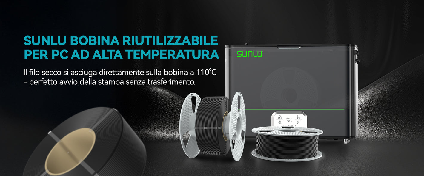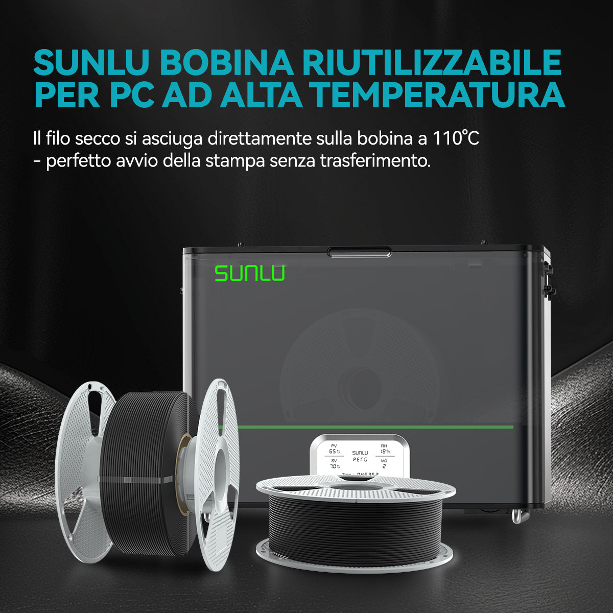 Dotato di bobina riutilizzabile e termoresistente, progettata per l'essiccazione diretta. Resiste a temperature fino a 110°C (230°F), garantendo prestazioni ottimali del filamento direttamente sulla bobina.