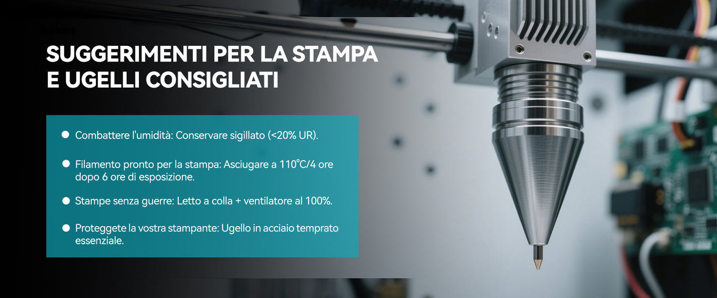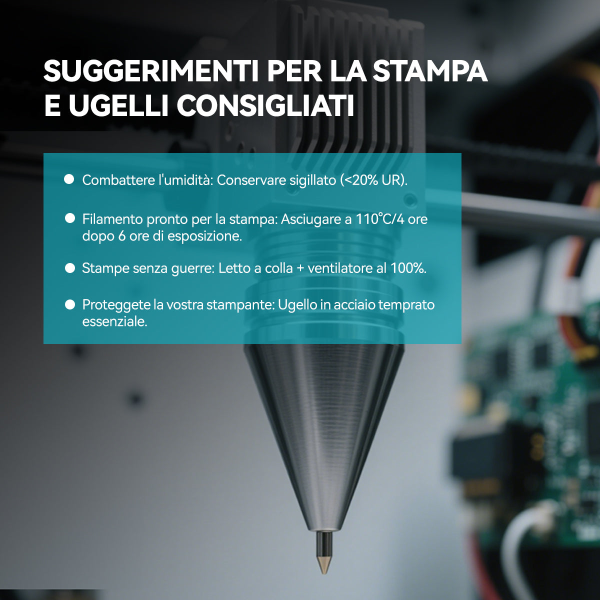 Asciugare il filamento appena aperto (4 ore a 110°C) se esposto all'umidità per più di 6 ore -