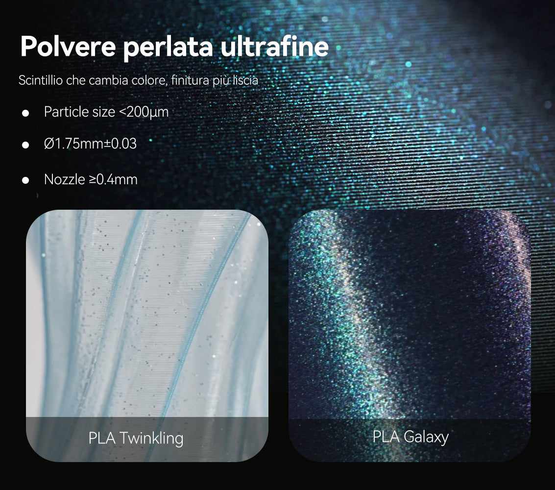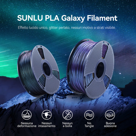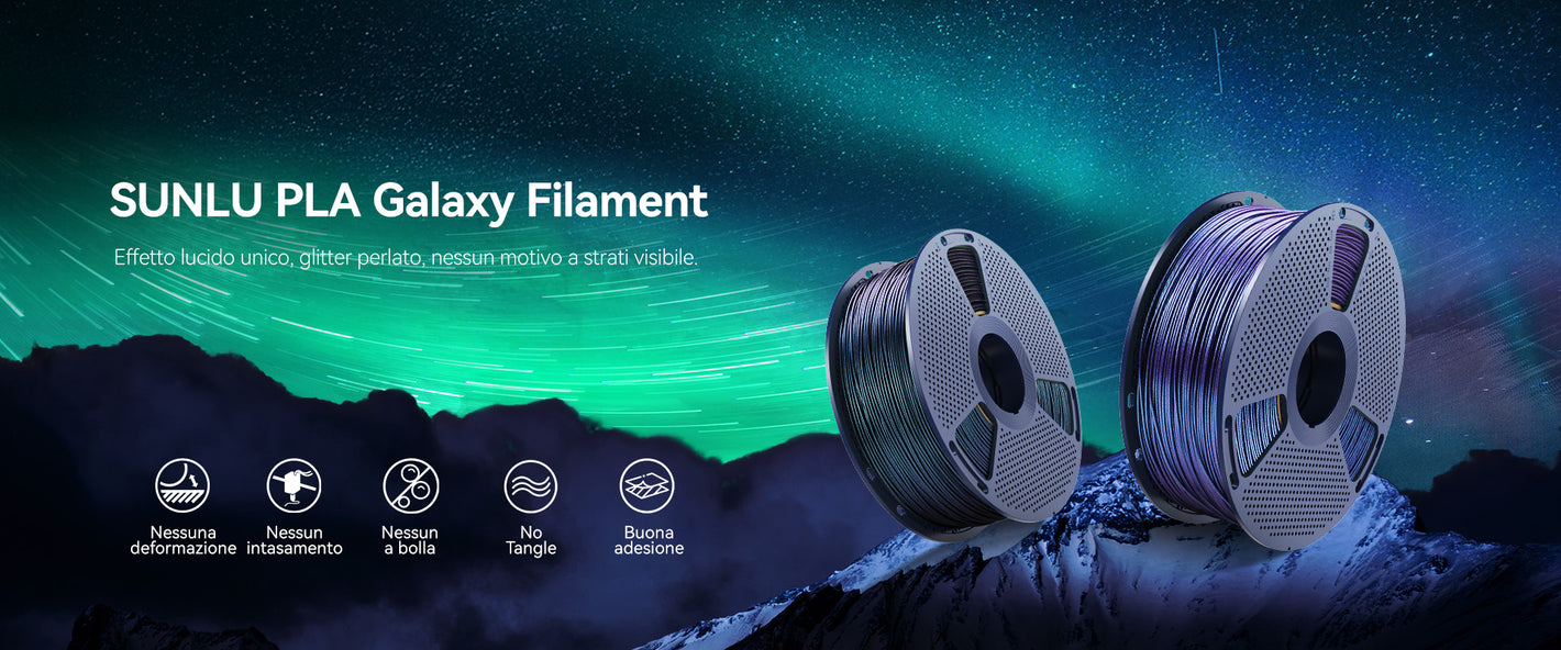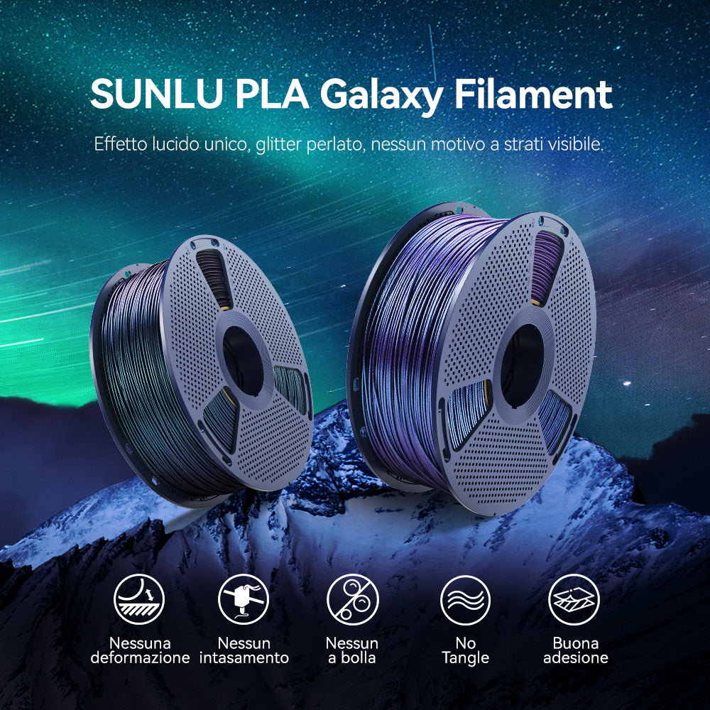 Ispirandosi alla bellezza della Via Lattea, il filamento PLA Galaxy di SUNLU combina un profondo sfondo cosmico con effetti di luce stellare scintillante. Grazie alla sua polvere perlacea ultraraffinata a cambiamento di colore (dimensione delle particelle <200µm), le tue stampe 3D riveleranno cambiamenti dinamici di colore sotto diverse angolazioni di luce. Il risultato è un finitura abbagliante e stellare che rende ogni stampa straordinaria e davvero unica.