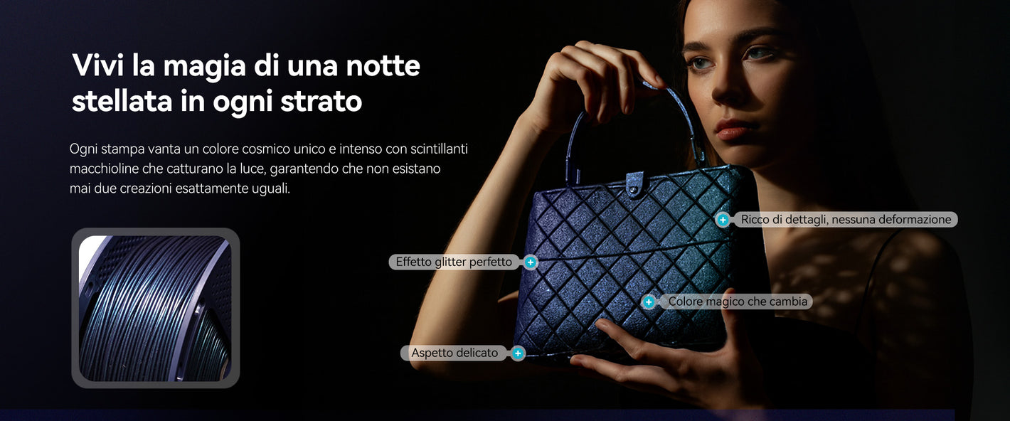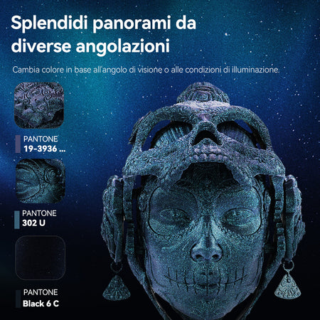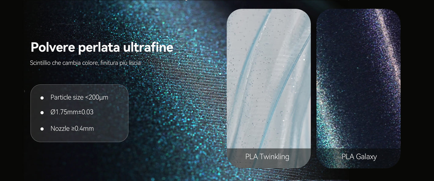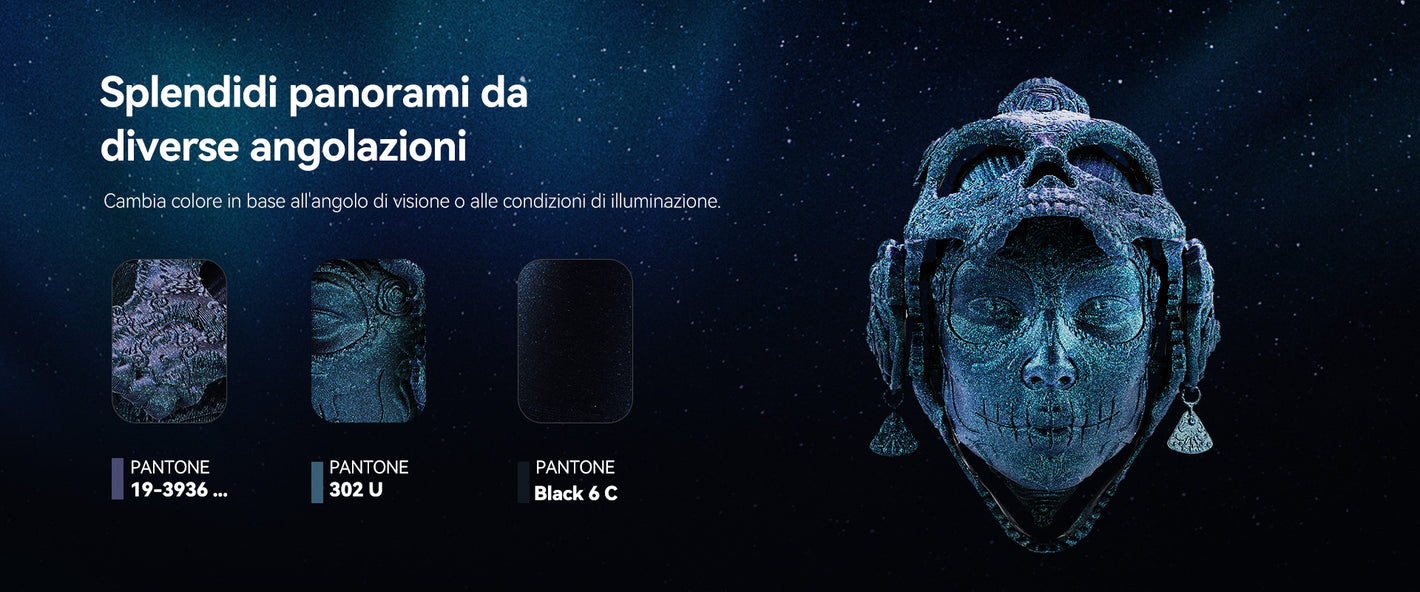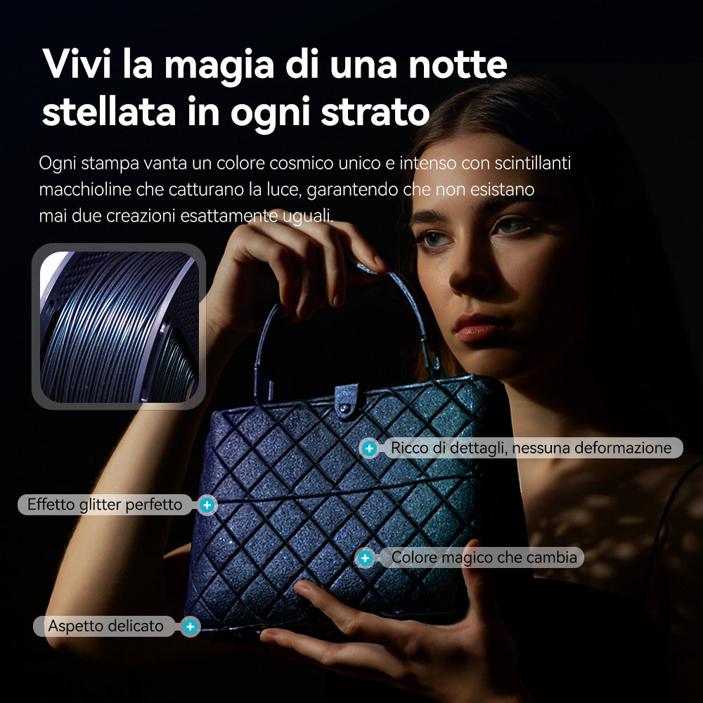 Ispirandosi alla bellezza della Via Lattea, il filamento PLA Galaxy di SUNLU combina un profondo sfondo cosmico con effetti di luce stellare scintillante. Grazie alla sua polvere perlacea ultraraffinata a cambiamento di colore (dimensione delle particelle <200µm), le tue stampe 3D riveleranno cambiamenti dinamici di colore sotto diverse angolazioni di luce. Il risultato è un finitura abbagliante e stellare che rende ogni stampa straordinaria e davvero unica.