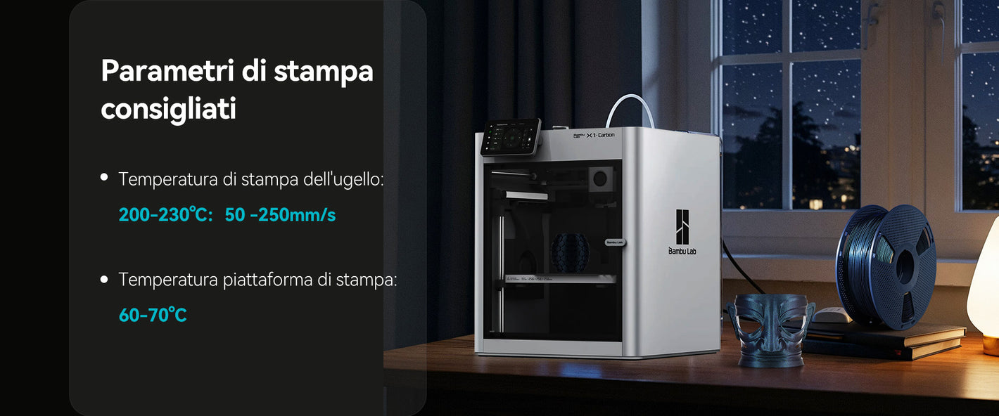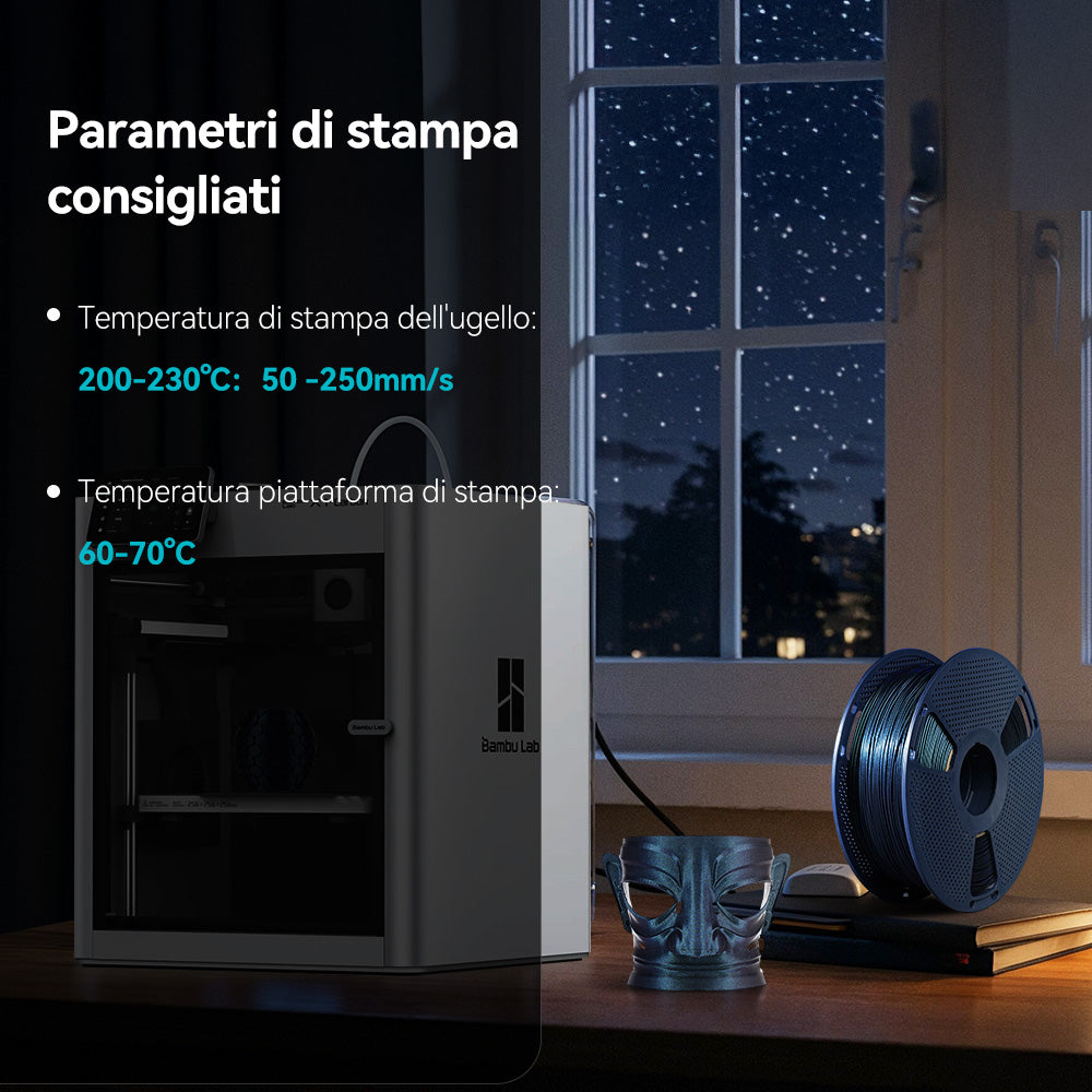 Questo filamento è progettato per minimizzare le linee di strato, conferendo alle tue creazioni un aspetto raffinato e professionale direttamente dal piano di stampa. La finitura perlacea scintillante migliora la superficie liscia, facendo risaltare ogni curva, bordo e texture con eleganza e precisione. Perfetto per i creatori che valorizzano sia bellezza che qualità.