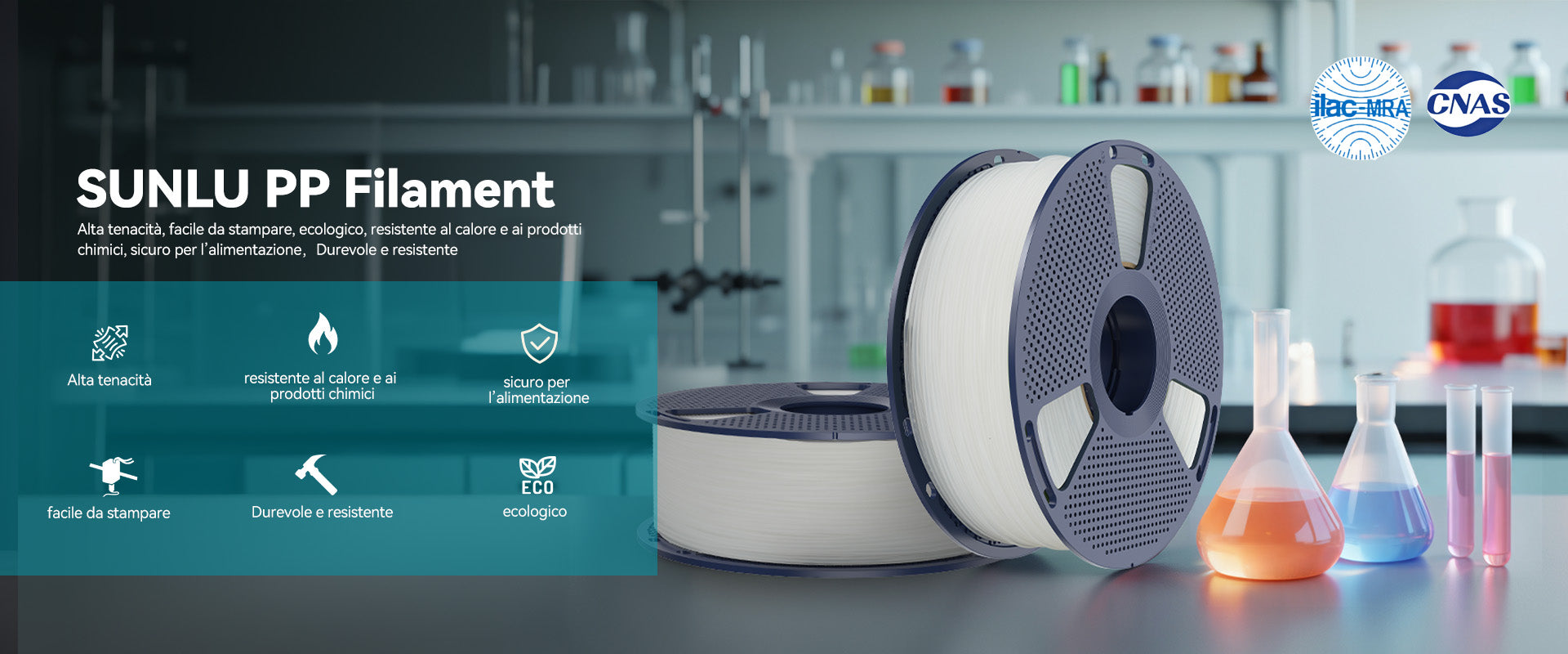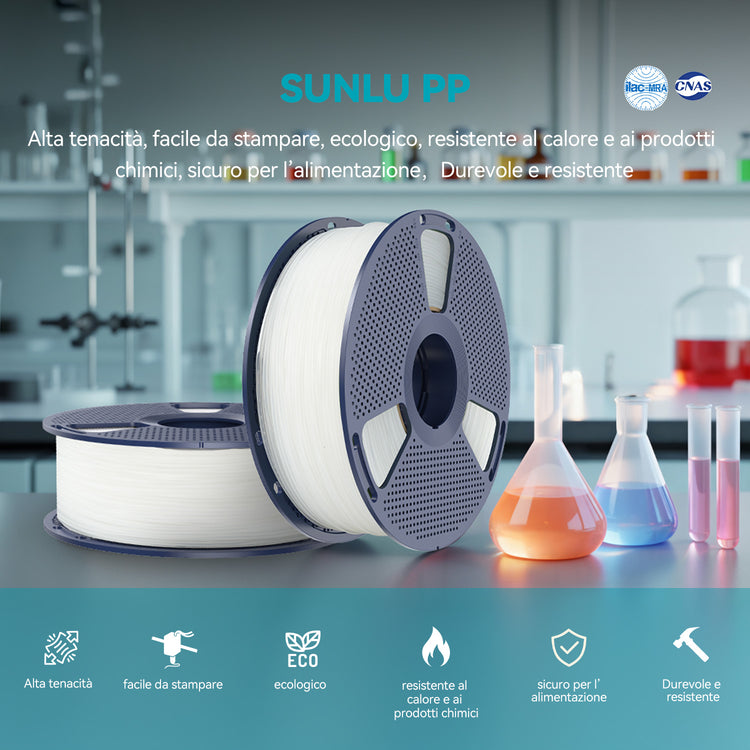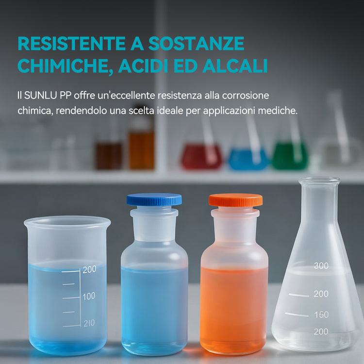 Il filamento SUNLU in PP è progettato con un'eccellente resistenza alla corrosione chimica. Il polipropilene resiste all'esposizione ad acidi, alcali e solventi, garantendo stabilità e prestazioni durevoli anche in ambienti impegnativi.