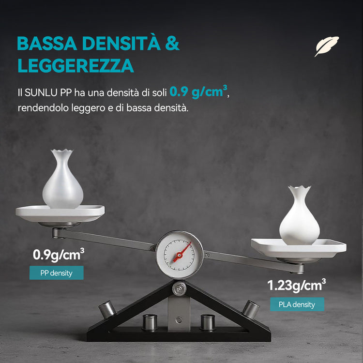 Il prodotto stampato è leggero (il PLA ha una densità di circa 1,23 g/cm³, mentre il PP ha una densità di circa 0,9 g/cm³), risultando così circa il 27% più leggero. Il filamento SUNLU in PP crea parti leggere ma resistenti, contribuendo a ridurre il consumo di materiale pur mantenendo alte prestazioni—ideale per stampe funzionali e progetti di uso quotidiano.