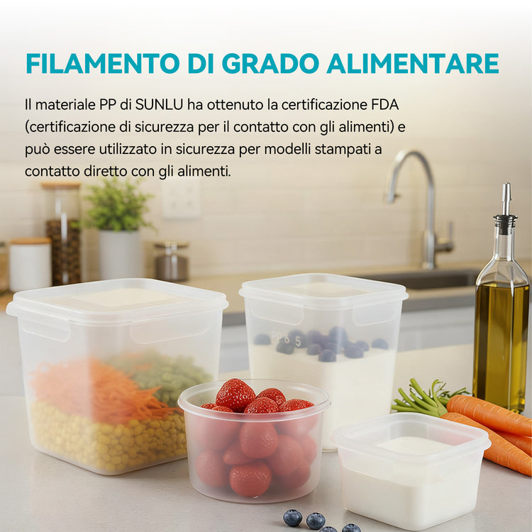 Il filamento SUNLU in PP è conforme al contatto alimentare, adatto per stampare contenitori, utensili da cucina, scatole di conservazione e altre applicazioni che richiedono sicurezza e affidabilità.